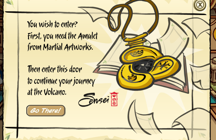 After the entrance rises from the ground, click on the door. You will be met with a note on the door telling you that the Amulet is needed to enter the Fire Dojo.
