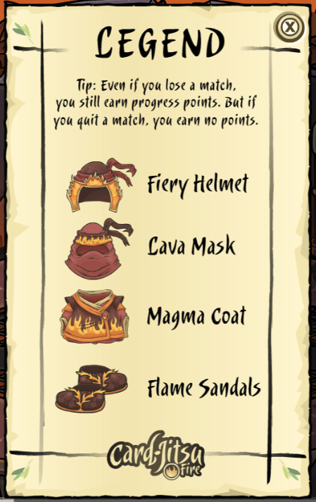 As you progress through Card-Jitsu Fire, you will earn pieces towards The Fire Suit.