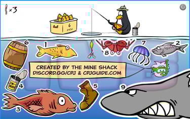There are 9 objects that your rod can interact with in Ice Fishing. This includes 3 types of fish, 5 different hazards, and 1 health source. Additionally, a pink puffle will occasionally swim by, alerting you to the next hazard.